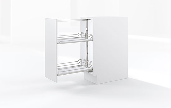• 20"-28"H Silver Soft Close Dispensa Short Base Pullout Organizer with 14"W Maple Shelves with Chrome Accents